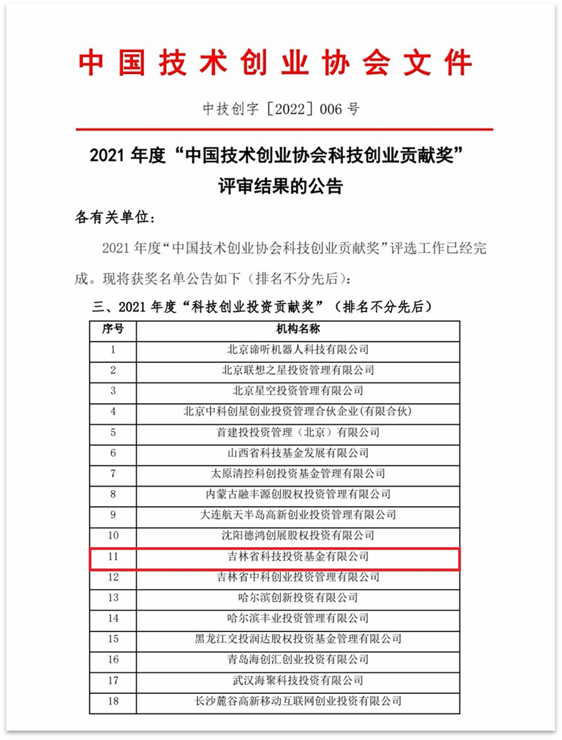 近日,“2021年度中國(guó)技術(shù)創(chuàng)業(yè)協(xié)會(huì)科技創(chuàng)業(yè)貢獻(xiàn)獎(jiǎng)”評(píng)審結(jié)果正式公示,吉林省科技投資基金有限公司(以下簡(jiǎn)稱“吉林科技投資”或“公司”)成功入圍,榮獲2021年度“科技創(chuàng)業(yè)投資貢獻(xiàn)獎(jiǎng)”(全國(guó)18家,吉林省2家)。