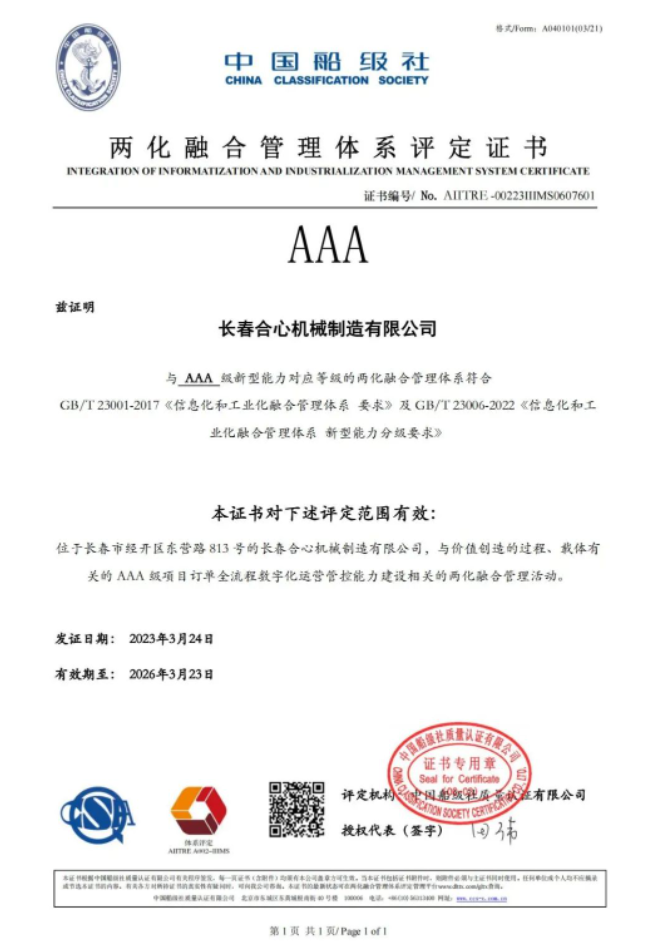 近日,長春合心機械制造有限公司(以下稱“合心機械”)宣布,公司已榮獲由中國船級社頒發(fā)的AAA級兩化融合管理體系評定證書。合心機械是吉林省首家獲得該資質的民營企業(yè)。