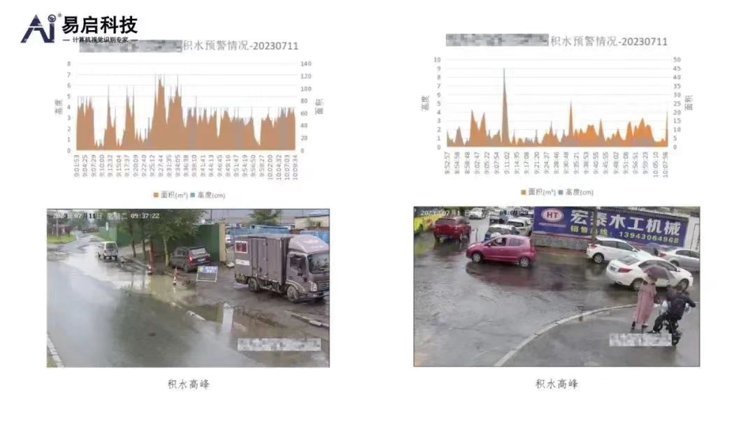 易啟科技城市防汛AI預(yù)警系統(tǒng)通過人工智能分析,實(shí)時(shí)智能識(shí)別不同區(qū)域,實(shí)現(xiàn)積水風(fēng)險(xiǎn)預(yù)警,系統(tǒng)可自主識(shí)別積水有無、估算積水深度和積水面積,自動(dòng)推送積水點(diǎn)位信息至用戶。