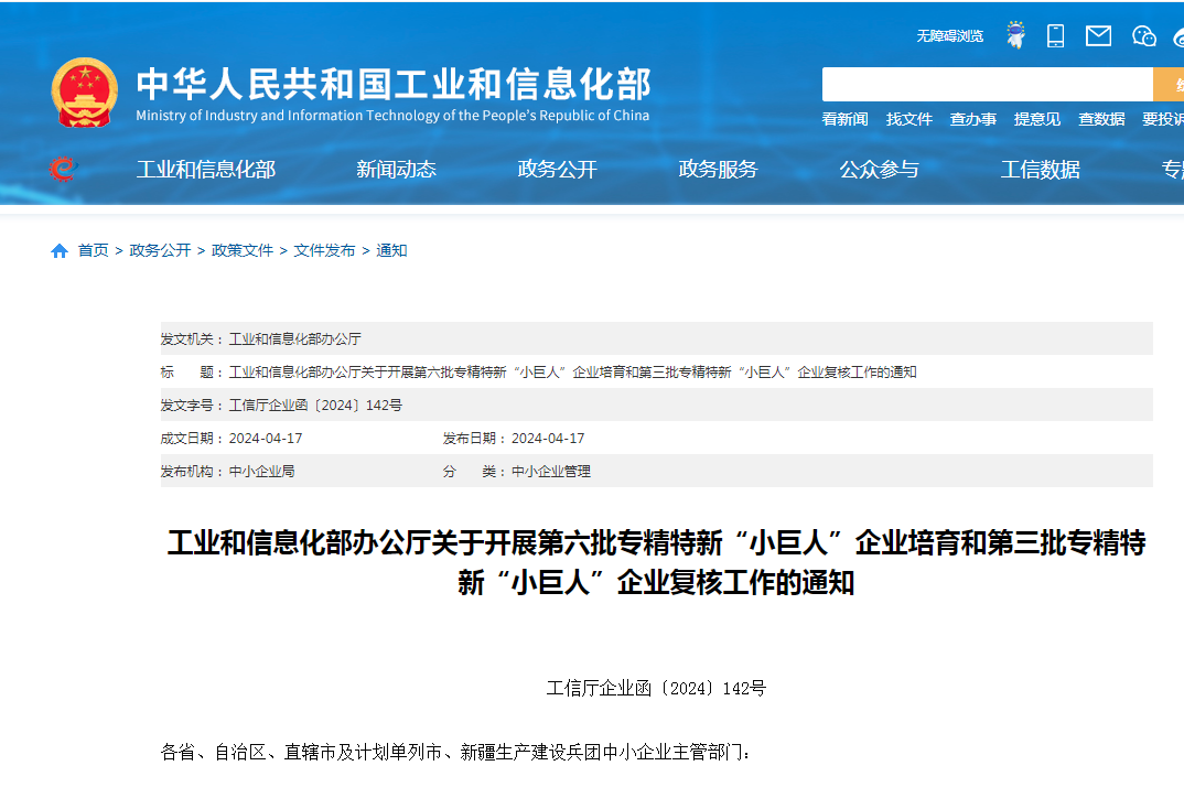 近日工業(yè)和信息化部印發(fā)通知,組織開展第六批專精特新“小巨人”企業(yè)培育和第三批專精特新“小巨人”企業(yè)復(fù)核工作。