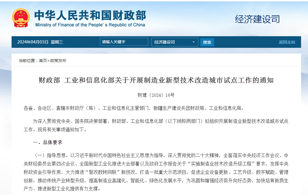 近日,財政部、工業(yè)和信息化部發(fā)布《關(guān)于開展制造業(yè)新型技術(shù)改造城市試點工作的通知》(以下簡稱“《通知》”)。