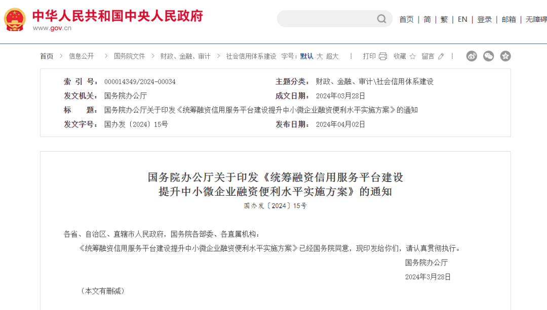 國辦發(fā)文:統(tǒng)籌融資信用服務(wù)平臺建設(shè),提升中小微企業(yè)融資便利水平