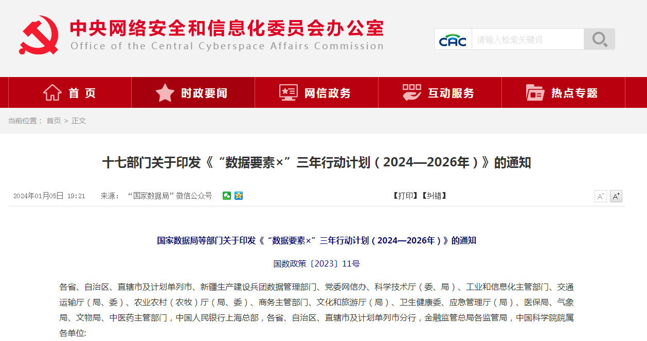 近日,國(guó)家數(shù)據(jù)局等17部門(mén)聯(lián)合印發(fā)《“數(shù)據(jù)要素×”三年行動(dòng)計(jì)劃(2024—2026年)》(以下稱《行動(dòng)計(jì)劃》),充分發(fā)揮數(shù)據(jù)要素的放大、疊加、倍增作用,賦能經(jīng)濟(jì)社會(huì)發(fā)展。